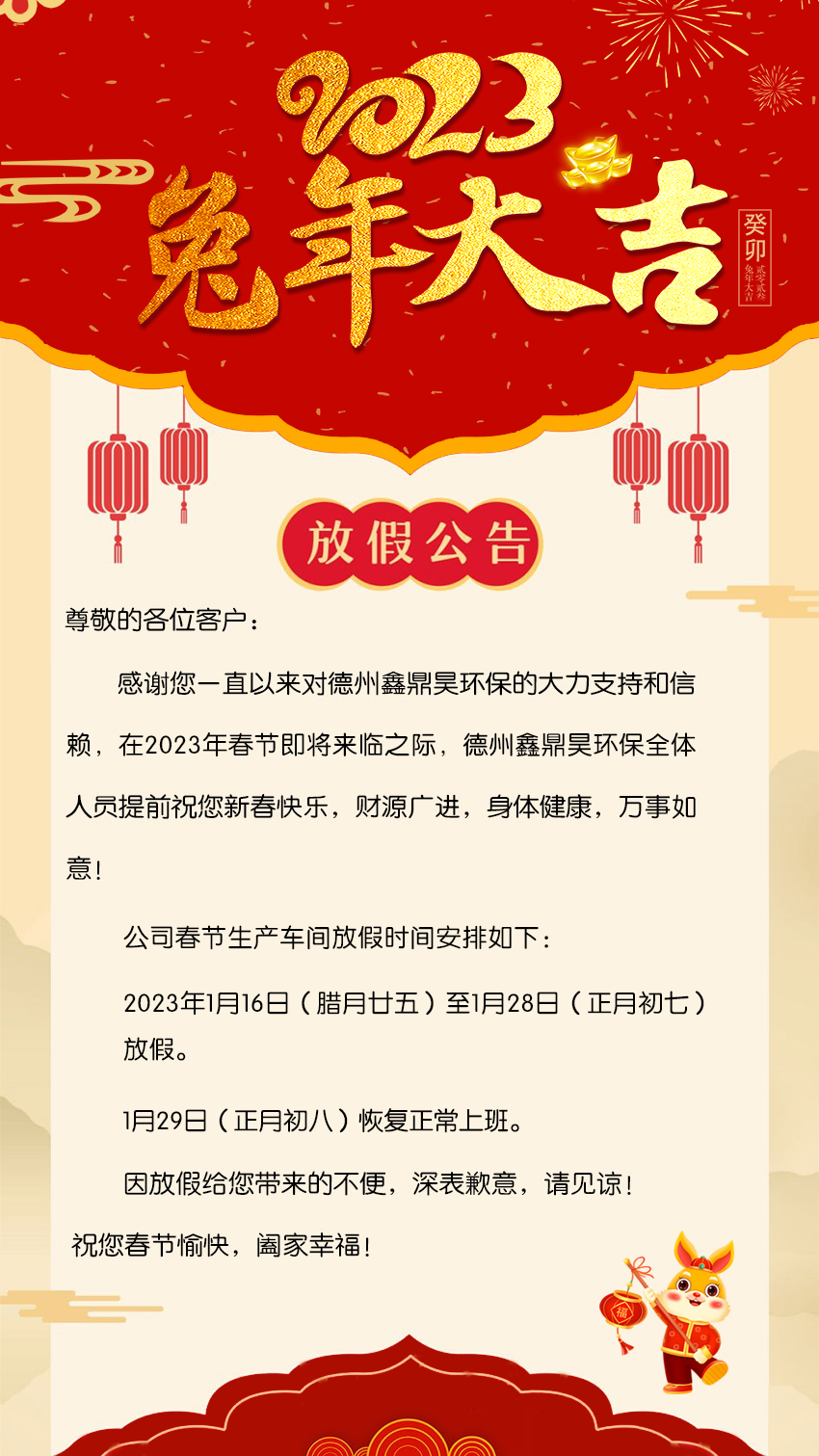 Thank you for your strong support and trust in Dezhou Xinding Hao Environmental protection. On the eve of the 2023 Spring Festival, all the staff of Dezhou Xinding Hao Environmental Protection wish you a happy New Year, a wide range of resources, good health and good luck!