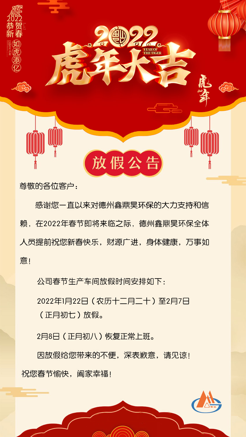 感谢您一直以来对德州鑫鼎昊环保的大力支持和信赖,在2022年春节即将来临之际,德州鑫鼎昊环保全体人员提前祝您新春快乐,财源广进,身体健康,万事如意!