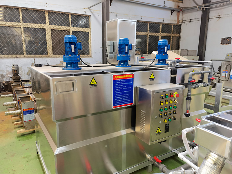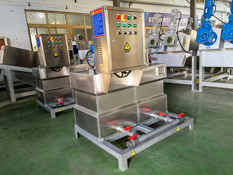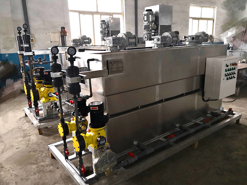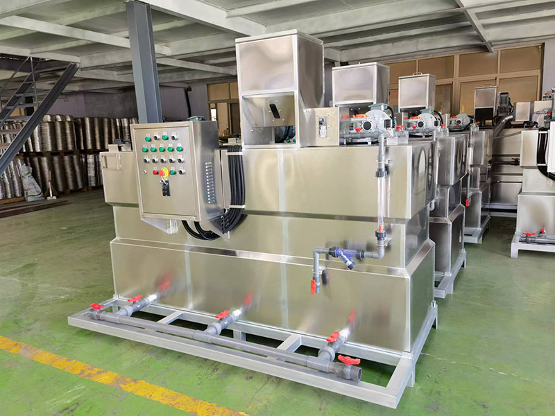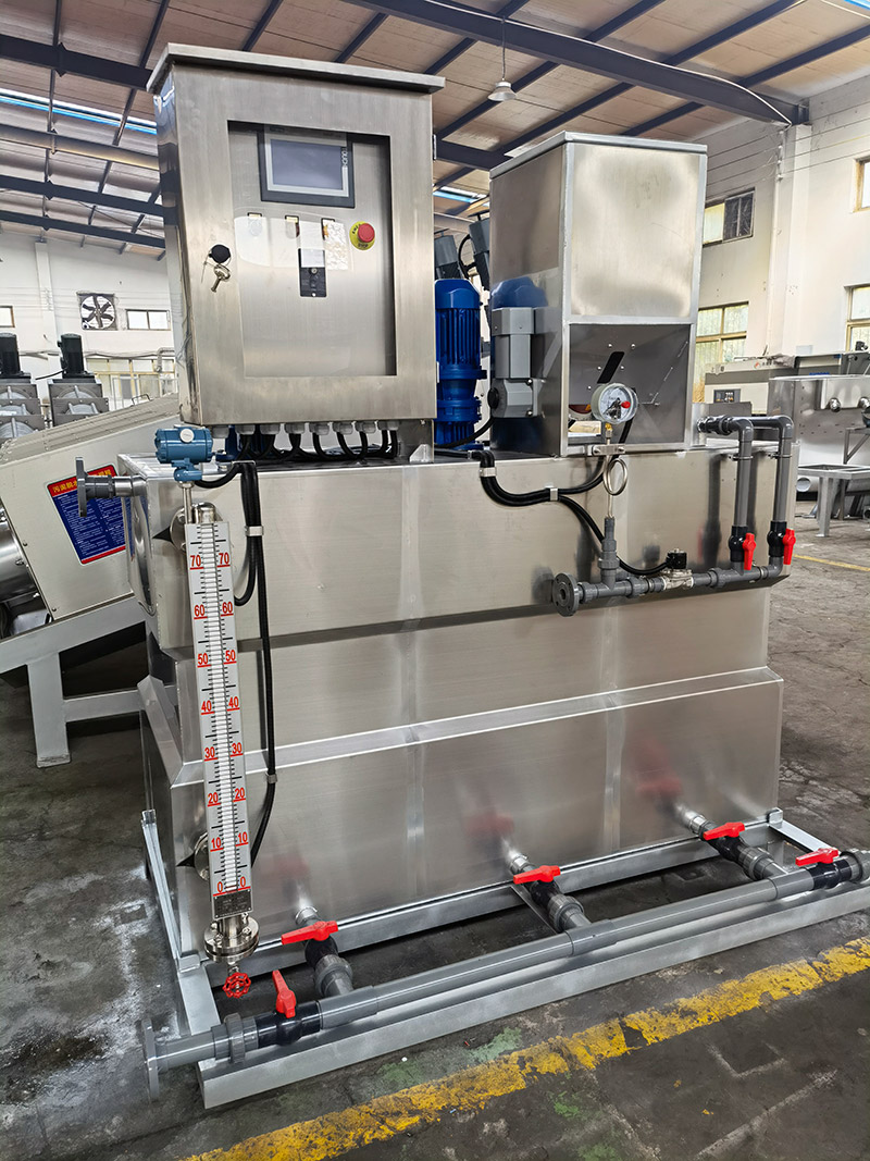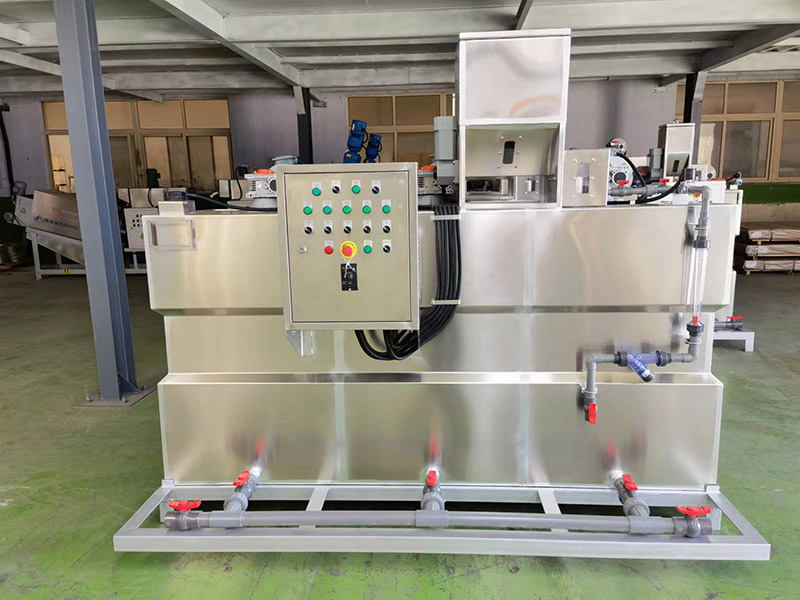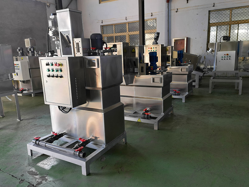 为解决此类难题,公司在吸收先进工艺技术基础上,研制开发了全自动加药机XDHJY系列一体化絮凝剂制备装置。全自动加药机是集溶药、熟化、投加于一体的全自动加药系统。该设备根据所需药液的浓度,控制投加的药剂量,自动将絮凝剂进行搅拌、溶解、熟化,再由加药泵投加到处理水中,降低了絮凝剂使用过程中的复杂程度,并使投加过程自动、准确,而且节省药量。